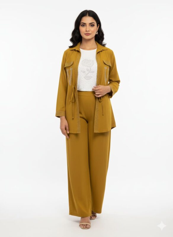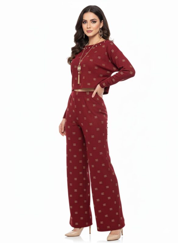 Showcase the elegance of our Red Co-ord Set with Gold Accents, featuring a cropped top with pearl details and matching pants. Perfect for a chic, sophisticated look.